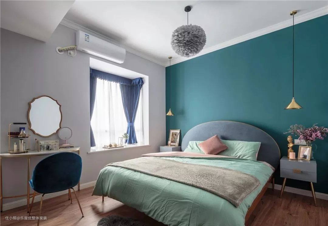 主卧靠床那个墙面是复古绿色,四周是浅灰色。主灯用的是非常有造型感的羽毛灯,营造出一种静谧温柔的气氛。