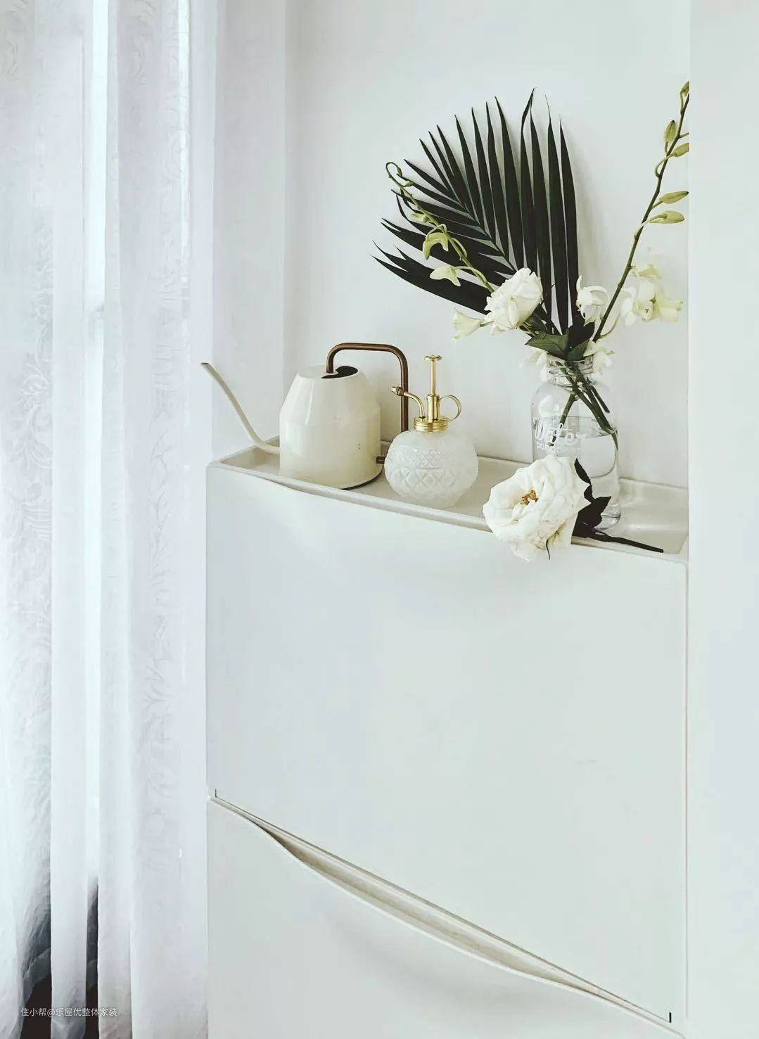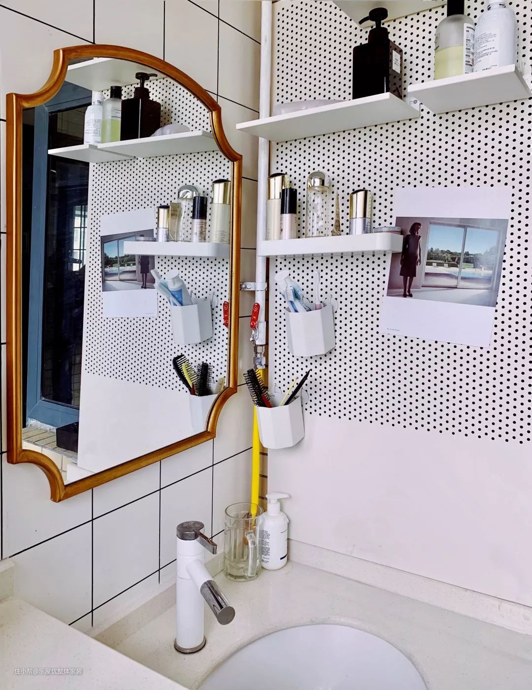 由于业主的使用习惯,主要的洗漱是在生活阳台,在墙上挂了一个洞洞板,放置了一些洗漱用品。另一侧是实用且好看的收纳柜。