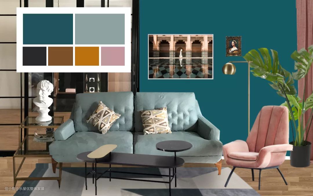 墙色选择了深灰绿+浅灰的搭配,和浅蓝色的沙发形成同一冷调,又和脏粉色单人沙发和窗帘形成撞色,使整个空间气质更为沉稳内敛。