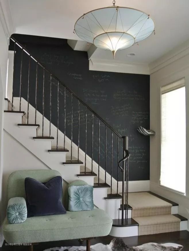 🔳楼道走廊:楼道走廊这种狭长的空间,总是让我们内心不自然的产生压抑感,而黑板墙则有效的缓解这种空间的乏味感,添加一丝灵动感,更好的融入周围环境。