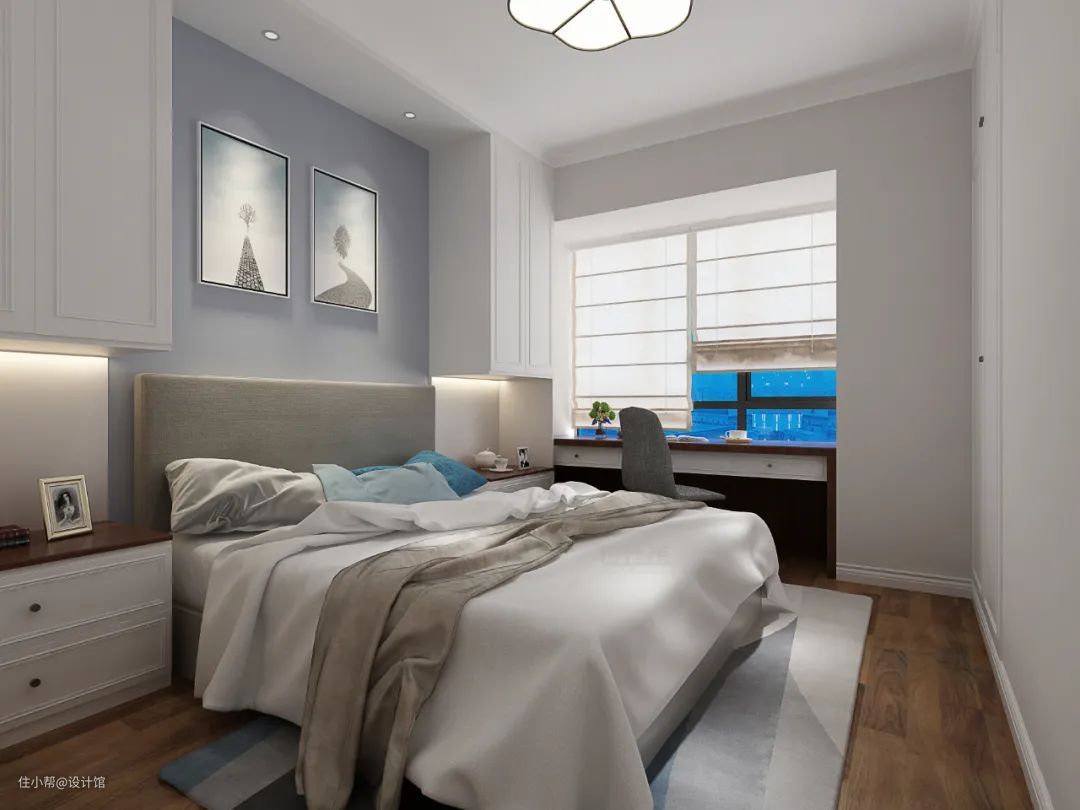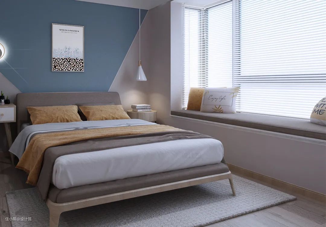 飘窗的高度是40-60cm,刚好与床头柜的高度接近,如果床靠着飘窗摆放的话,那么飘窗就可以利用起来充当床头柜功能,睡觉时的眼镜、手机充电等,都可以放在飘窗上了。
