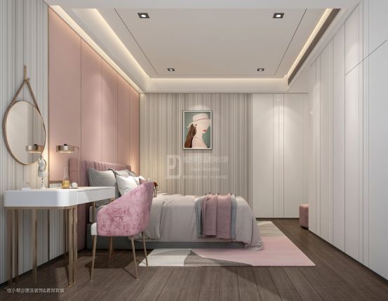 以自然清新的粉色为主题,融入淡雅的床品和定制柜营造出活泼而细腻的氛围,创造一个梦幻温馨又舒适的环境