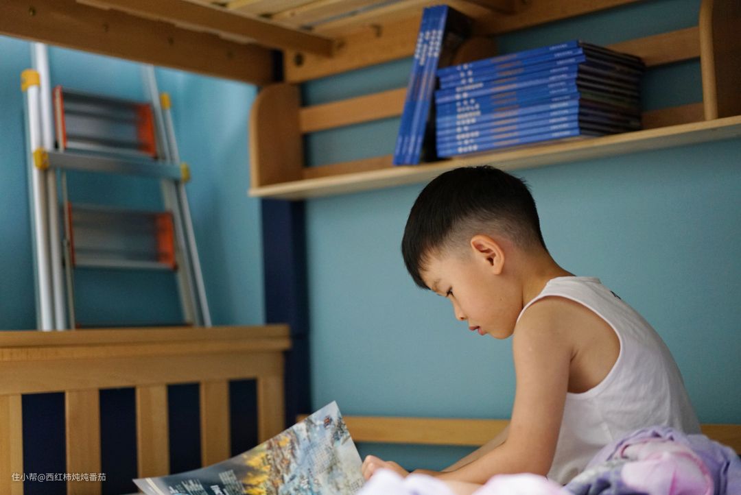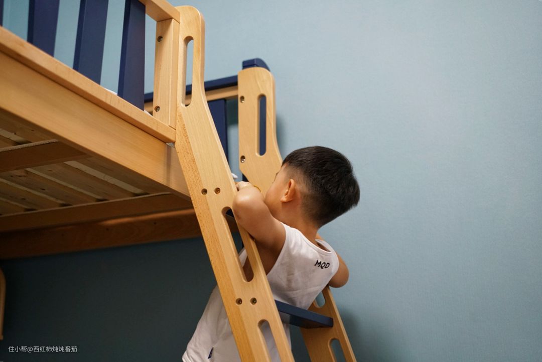 小朋友习惯了跟大人睡一起,想要一下子分开是很难的,于是就想到了用高低床过渡。期间,由楼主在上层“陪床”,孩子则睡在下层。
