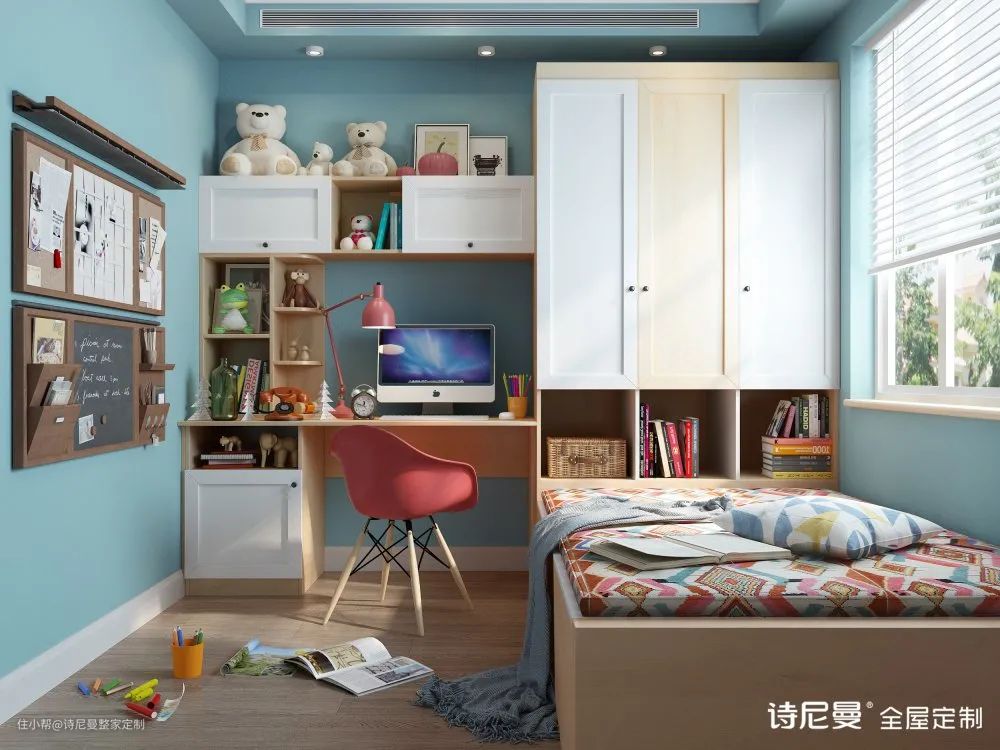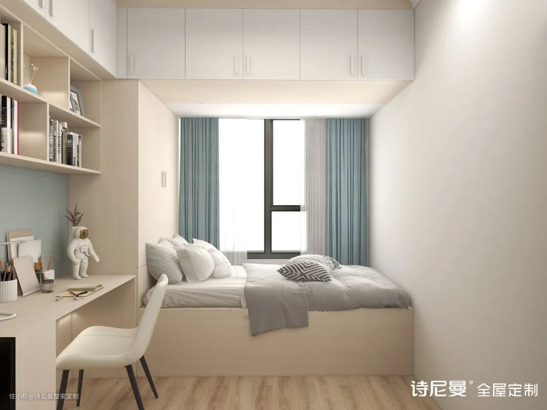 有人会说把衣柜做到别处就好了嘛——不,事实上有些小房间才5~6㎡甚至小于5㎡,又想要放下衣柜,最佳方法就是把衣柜设计在床上方,节省空间的同时也能存放衣物。