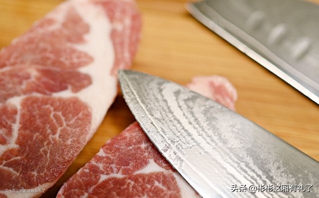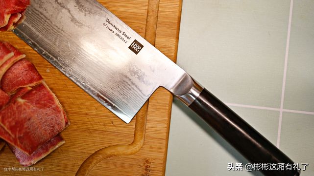 ▲被测试者就是切片刀了。大家看到化冻之后鲜红的牛肉就知道,测试顺利通过,一片片冻肉切下来毫不费力。黑檀木的刀把,握感不错,防滑性能好,属于越用越好用的类型。说说自己在切肉过程中的感觉。说实话,火候这把大马士革钢切片刀在使用上感觉和其它刀的区别并不是非常明显,但总体上要更省力一些,或许大马士革钢肉眼不可见的锯纹更利于切割。也有可能是新刀,刀刃还是新出炉的锋利。个人觉得有待提高的是切片刀的厚度,总感觉纤薄的一些。