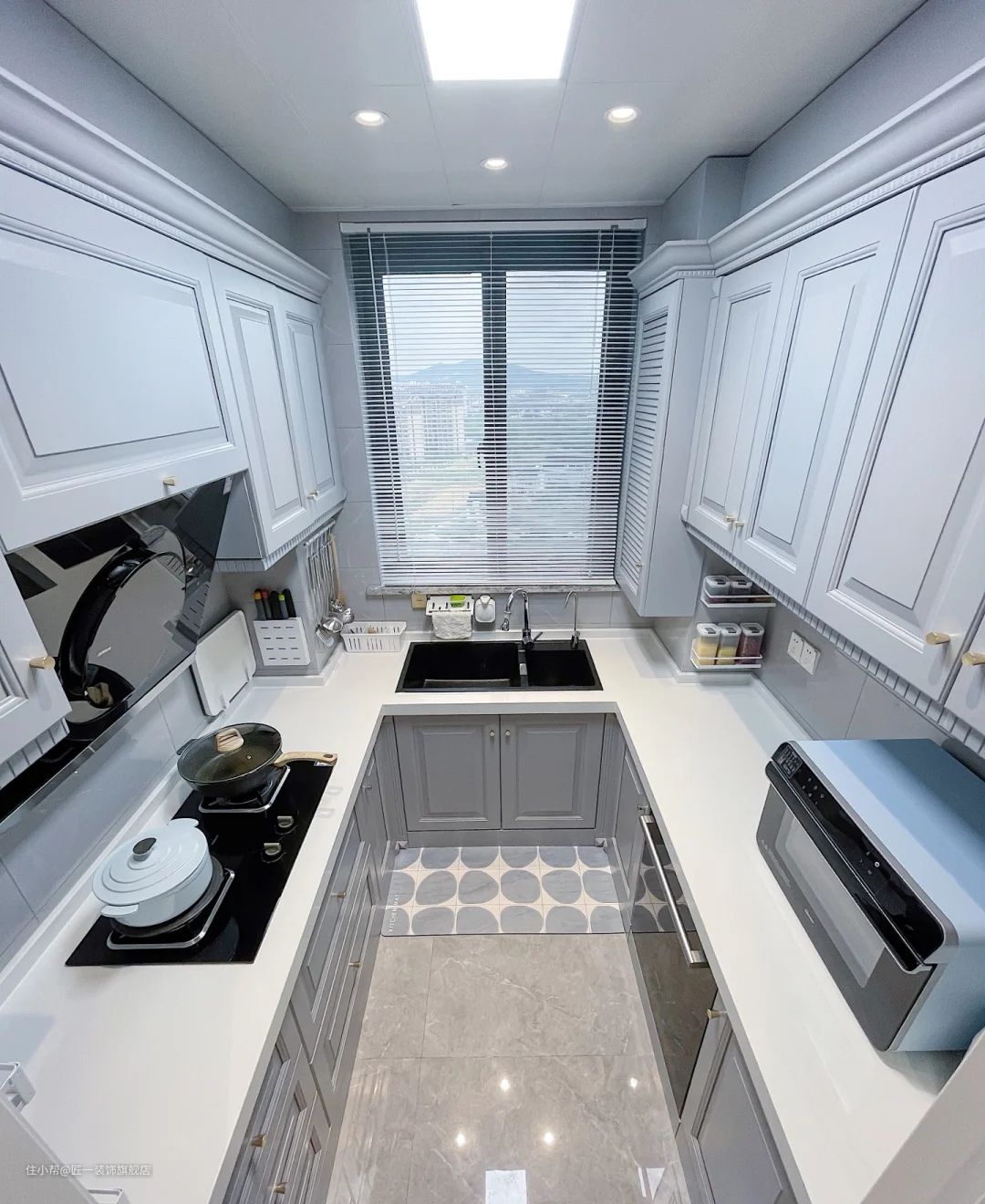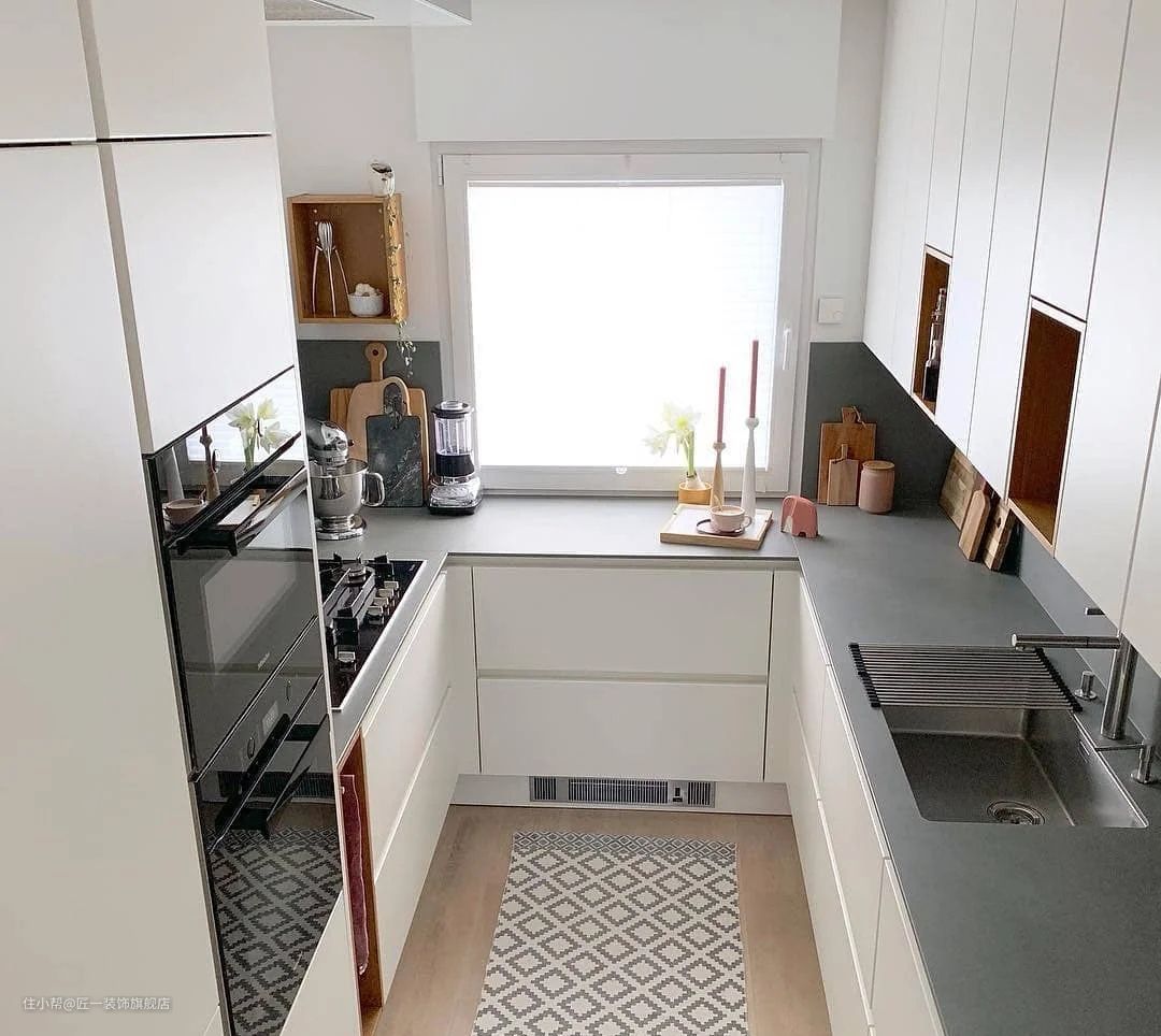 橱柜覆盖三面墙,最大限度地增加台面空间。洗涤、烹饪、操作、贮藏功能划分明确,还可以多人共同操作。注意灶台面的前后需要挡水条,橱柜下方收纳尽可能做部分抽屉,可以放勺子,叉子,还有零碎的东西。