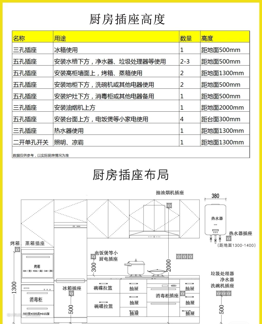 ②水槽下方:至少预留3个以上插座,【洗碗机、小厨宝、净水器和食物垃圾处理器】