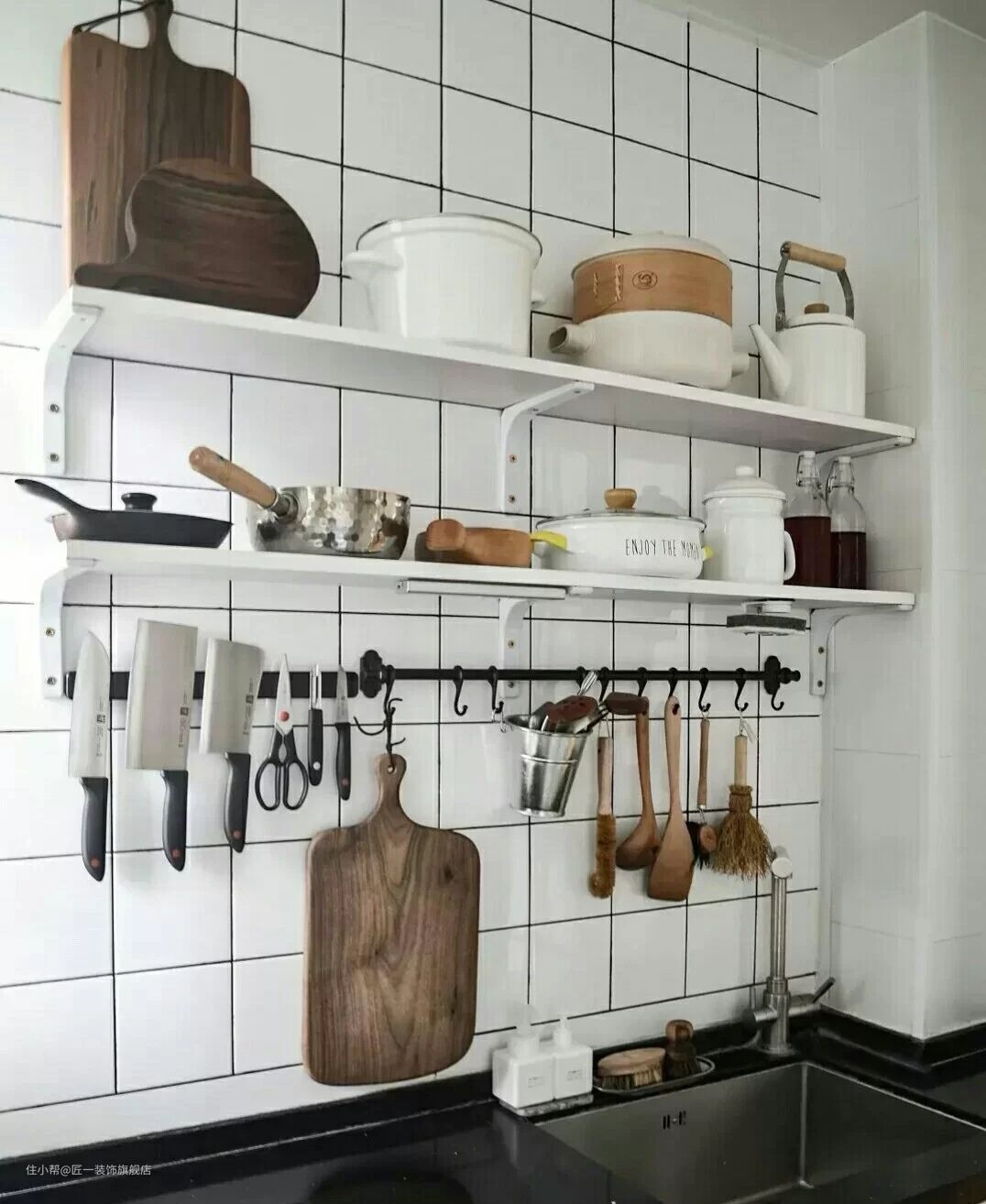 厨房要收纳的瓶瓶罐罐全放到柜子里,拿取不方便,放桌面上又显杂乱,用开放式的置物架,或者洞洞板非常方便。