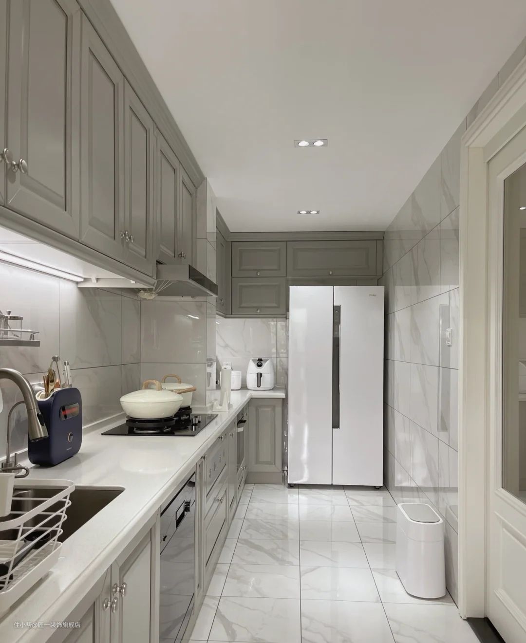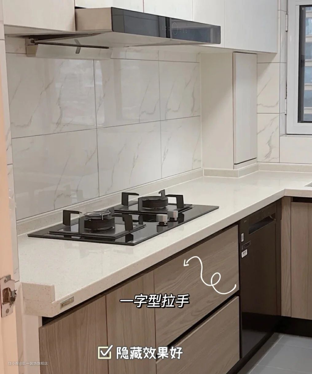 嵌入式拉手就是大家都知道的隐形拉手,安装在橱柜门上简洁大方,有效减少“藏污”,也不用担心磕碰到,实用性较高。不过在安装的时候要注意留缝,在柜门与柜门之间留一条大概3cm的缝隙,太宽或太窄都很难达到效果。