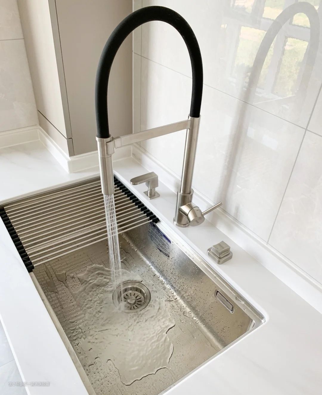 扩大了冲水面积,360度无死角转动,边边角角卫生轻松搞定。在选择上形状要选大弯型的,出水柱离出水口要达到20cm以上,洗锅碗,水不容易掉到台面上到处都是。