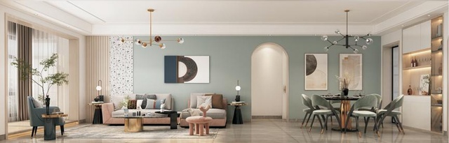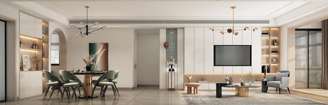 餐厅则选用了颜色更加沉稳的抹茶绿六人圆餐桌,既能够满足一家三代人的用餐需求,又可以在空间上突出重点,与侧面放置的奶白色餐边柜相互呼应,中间开放区域内嵌隐形灯带,与餐桌上方的叠层金属吊灯相搭配,营造出温馨舒适的用餐氛围。