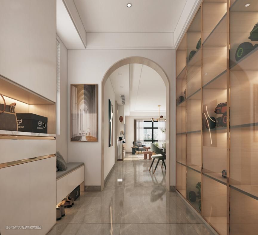 进门玄关区域做弧形拱门设计,避免“入户即客厅”,上方天花板做简单吊顶,下方右侧打造茶色玻璃展示柜,配合隐形灯带,提高空间照明和采光条件。