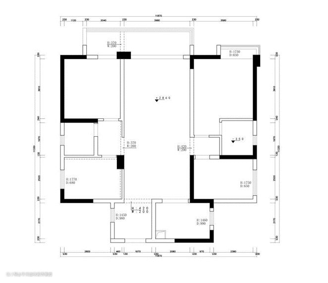 从平面建筑图中,我们可以看出房子的户型结构是比较方正的,分配给每个房间的采光也比较均匀,但各分区布局相对零散。因此,设计师便决定在业主的需求和审美范围之内,将新房的风格定为现代轻奢,并融入时尚前卫的装饰元素。