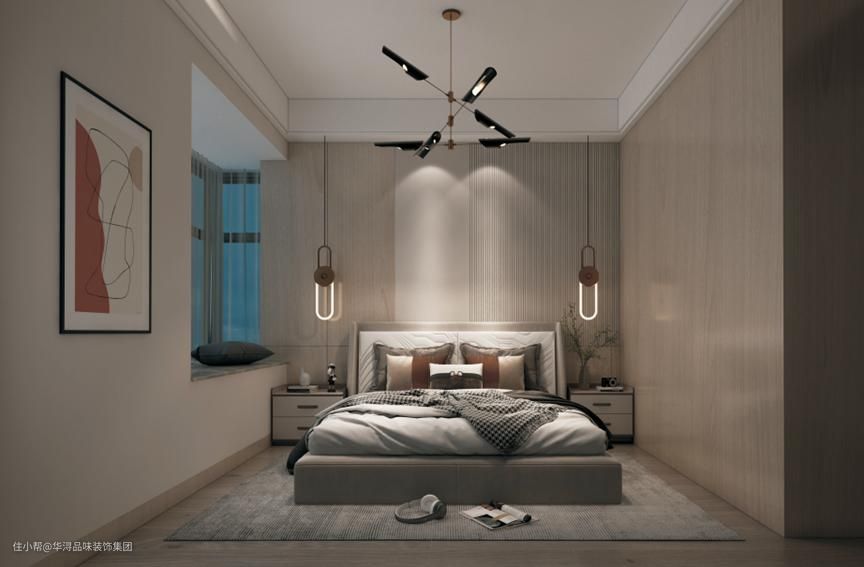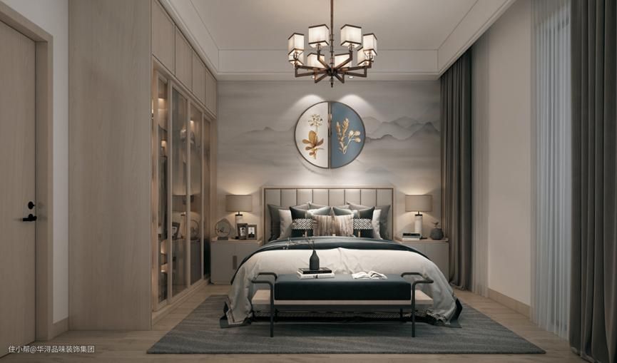 主卧的设计重点突出在舒适度和收纳量上,在整体的装饰上则更偏向于中式风格,以柔和的原木色和浅灰色为主调,营造出一个良好的休息氛围。