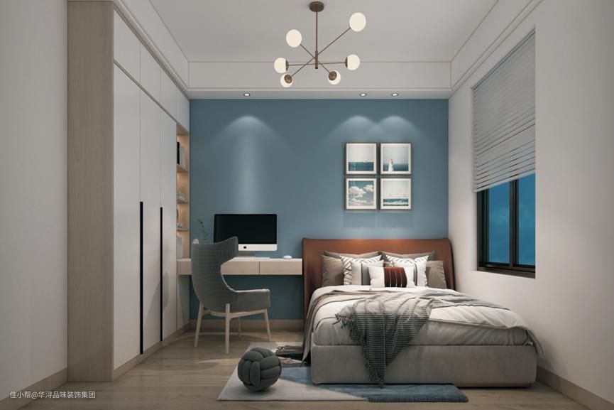 女儿房的设计以实用性和美观性为出发点,选用了低饱和度的海蓝色为床头和书桌背景墙,家具的摆设方面,以简单为主,只摆放了一张双人沙发和成衣柜,书桌与柜体连接,既节省空间,又简约大气。