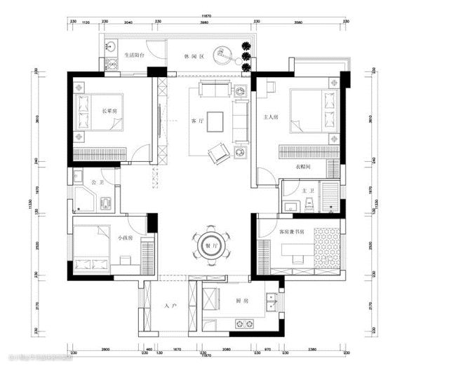 - 在原户型上保留了三个独立的房间,只是把主卧和次卧的关系做了调整,主卧设置衣帽间,保证空间的最大利用率。