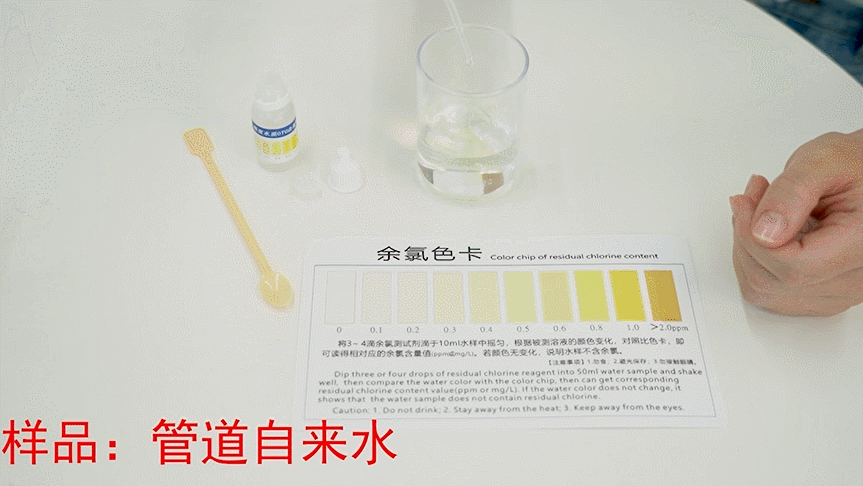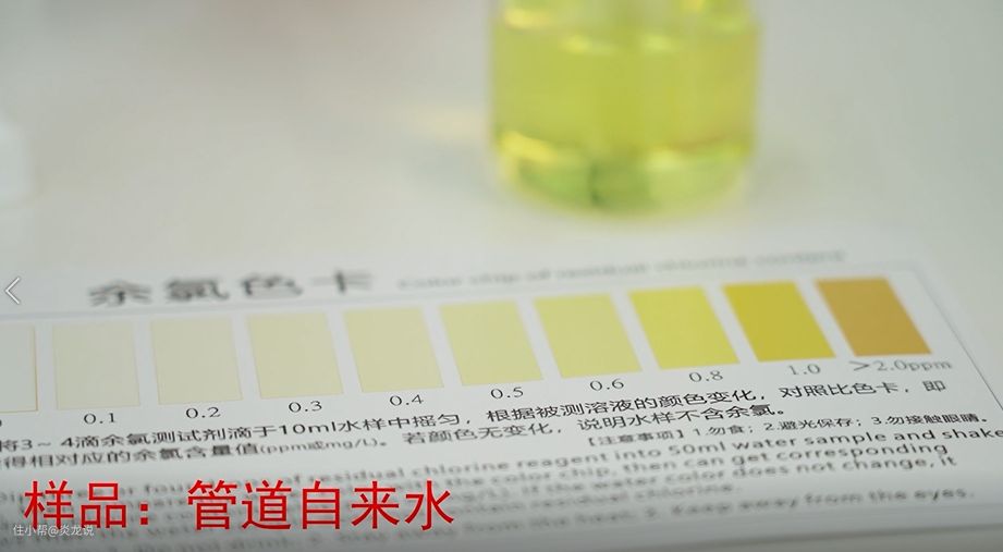 首先是除氯测试,在管道自来水里加入余氯测试液,明显可以看到水的颜色很快变黄。
