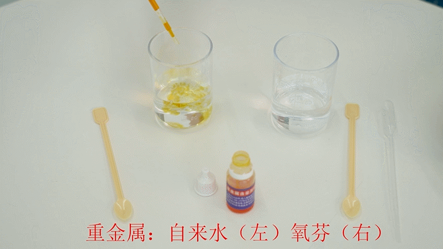 同等水量,加入同等重金属测试剂,搅拌后可以看到自来水的样品变红,而氧芬磁解水龙头净水器的水样品则是变黄。测试结果表明了自来水的重金属含量比较多,而净化后的水变黄则表示不含金属或含量低,也证明了氧芬磁解水龙头净水器的净化能力。