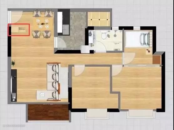 在沒有入户玄关的状况,运用提升隔墙/玄关隔断的设计方案,造就出一个假的入户玄关,解决进门处见厅的难堪。如下图: