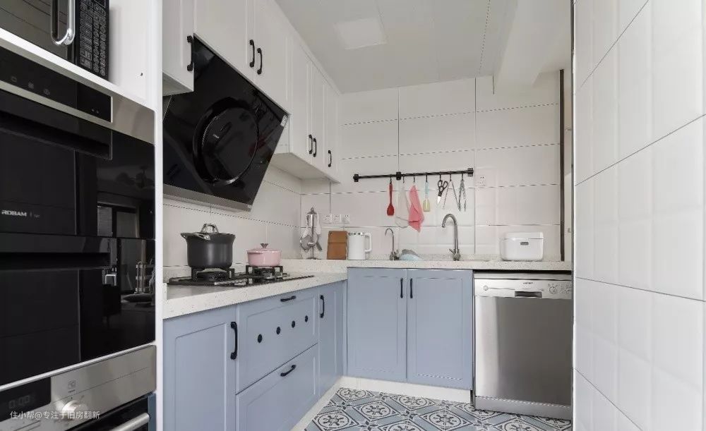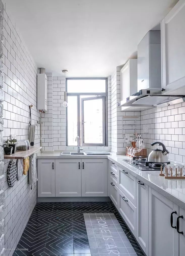 在一字型的基础上多了一个转角,就形成了L型的布局。把水槽和灶台放在两端,中间留空的地方作为操作台,平时洗菜-切菜-炒菜的动线布局也非常的合理。