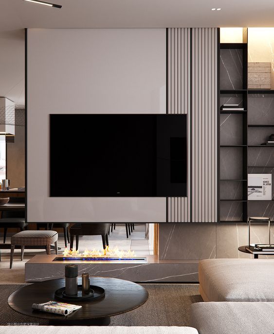 ●地台:结合电视墙整体优化造型,局部抬升做地台,上面也能放些摆件和绿植等,甚至有些家庭会连着花坛一起做,或者在地台上留壁炉,增加氛围感;