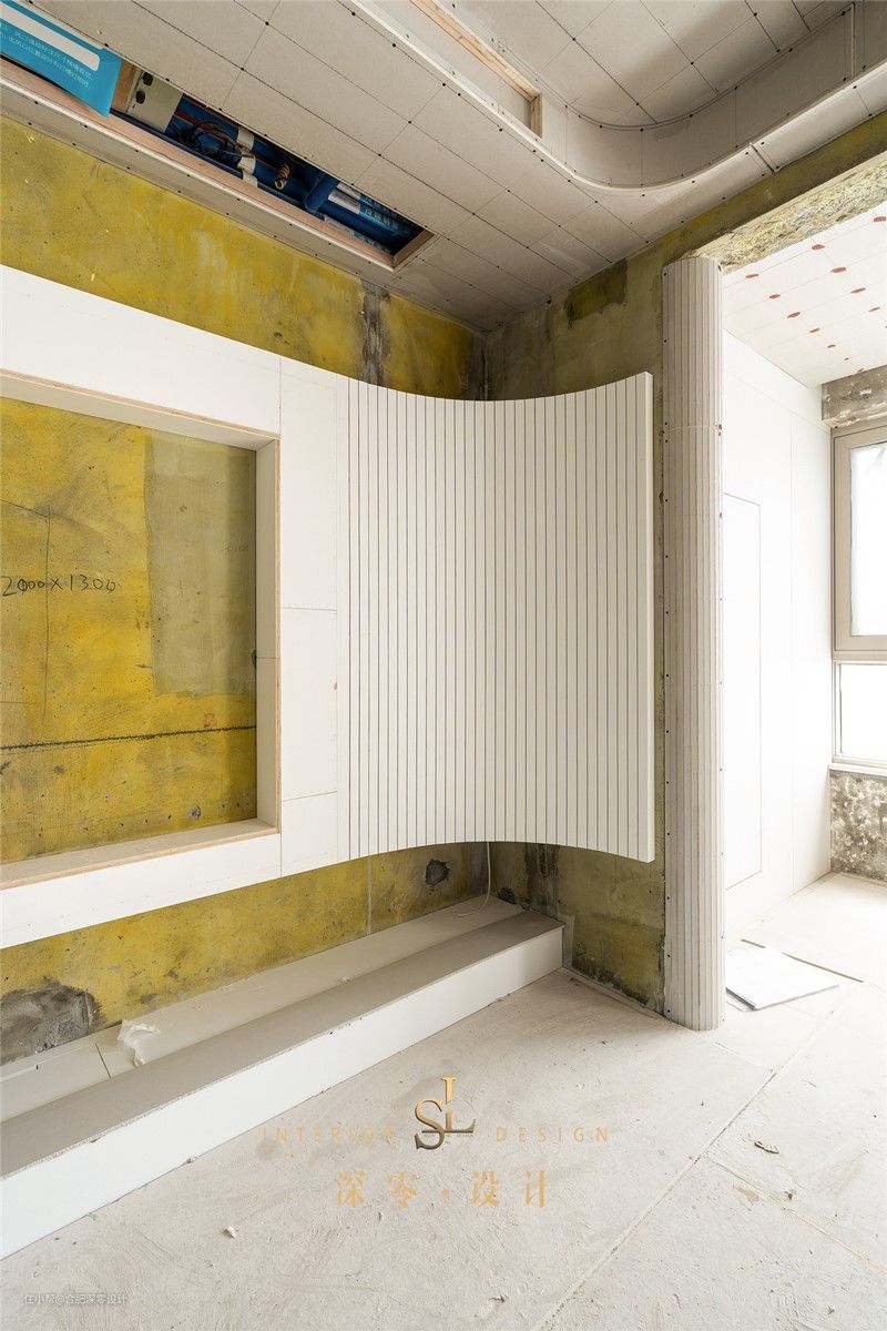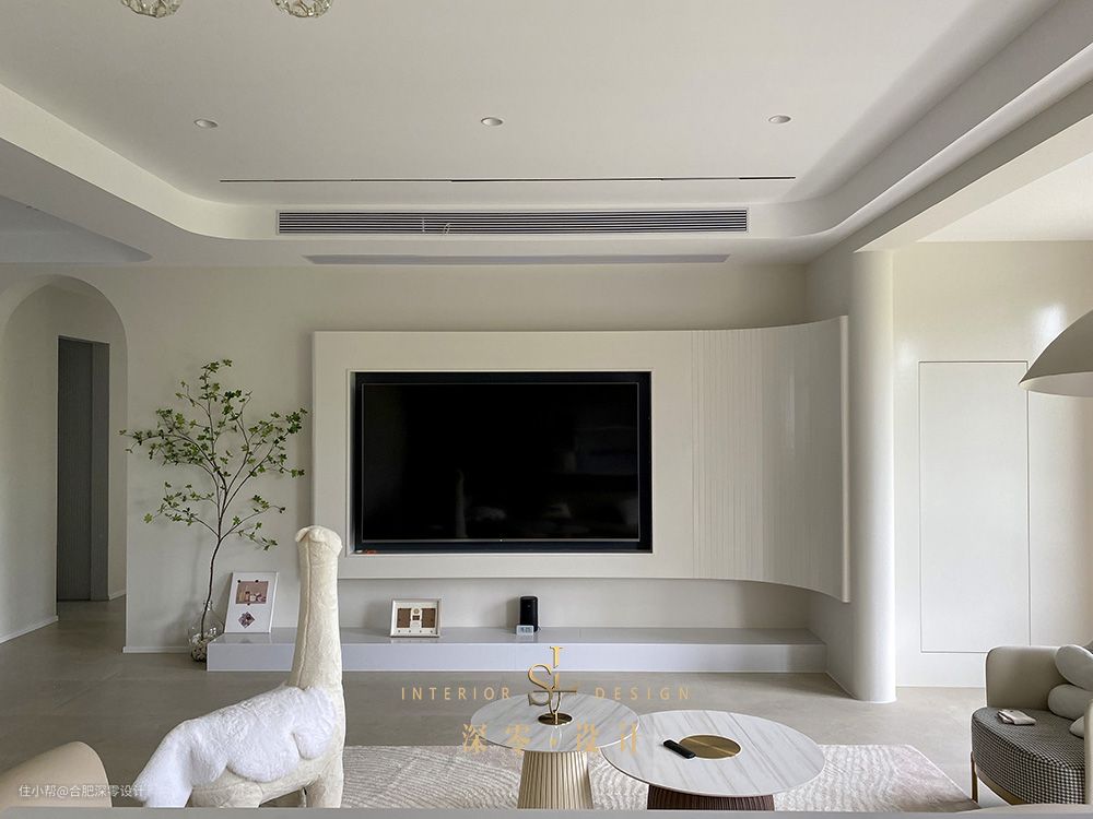 电视墙造型是木工师傅现场做的,用木工板+混油做出实景效果,靠近墙角专门做了弧形过渡,增加曲线美,走线也会更加流畅,跟转角、吊顶的弧形相互映衬。