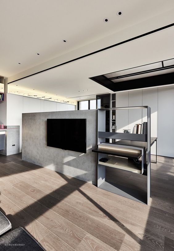 客厅空间比较充足的,可以新砌一堵半墙做隔断,顺便充当充当电视墙,还能多出一个功能区,后面做书房、卧室、玩乐区等都行。