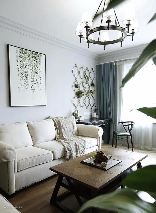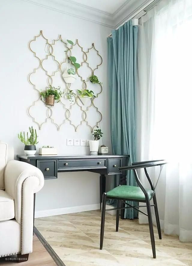 客厅本身就不大,只是摆设了一组简单的三人布艺沙发,靠近窗户留出了位置摆放书桌椅,墙面上再挂上一组装饰物,让整个氛围都变得有生机多了。