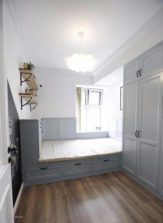 儿童房也是直接装的整体榻榻米组合柜,因为原本打算摆放床头的位置顶面有梁,睡觉会有压抑的感觉,所以调了头装床头,空间虽然有些不太规整,但是好在还是实用多了。