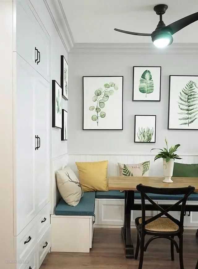 不光对面有玄关柜,而且还在入户的旁边也装了一组柜子,直接将入户的这个不规则空间设计得方正有序,让户型变得规整起来,侧面就是餐厅空间,哪怕空间并不大,但是带上卡座的设计就变得温馨有情调起来。