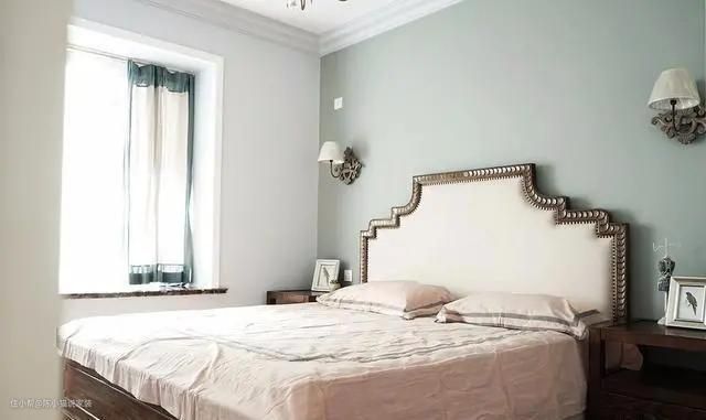 主卧没有做吊顶,直接安装的顶角线,背景墙刷成淡淡的薄荷绿,效果清新又舒适。