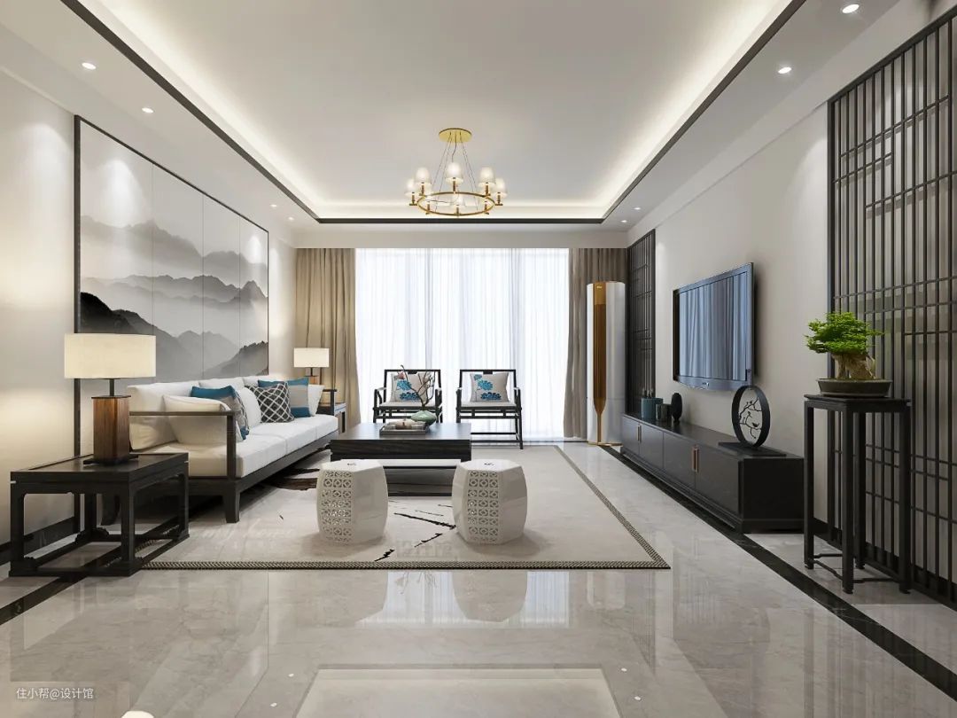 在中式风格的设计中,端景台(架)是比较常见的设计,如果觉得电视墙太空没有中式设计氛围的话,可以在电视柜旁边摆上一个端景架,并在端景架上摆一盆盆景,增添空间的禅意与档次感。