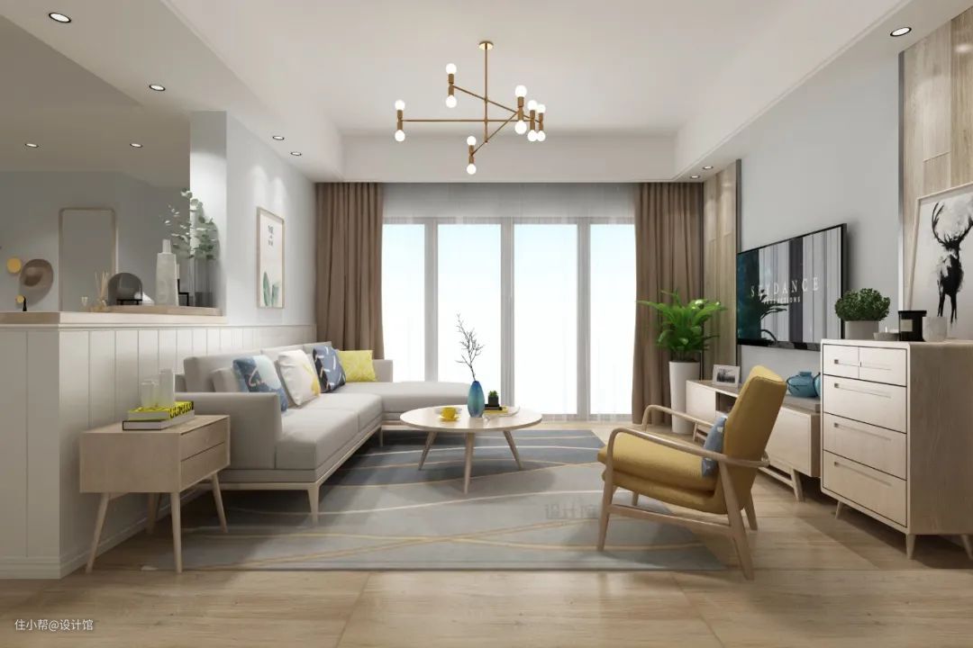 现代年轻人的客厅布置中,一般对茶几的要求都不会太高,通常都会采取小尺寸的茶几设计,然后在边角位置还会配上专属的小茶几,喜欢看书的话,也可以把边几换成小书架,这些小边几/书架,平时就可以放在电视柜的旁边了。
