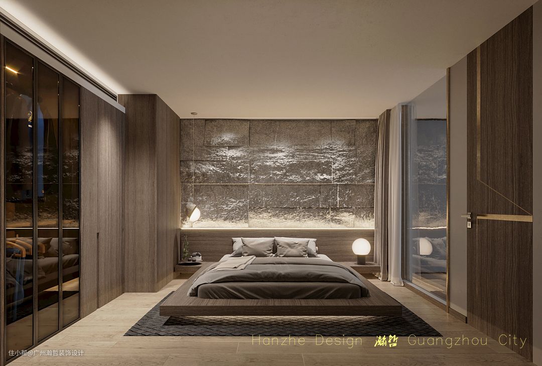 卧室做了大大的落地窗采光,悬浮式的床,和暖木色的纹理,辅以灯带、小台灯,让空间呈现静谧、安宁的归属感,让人卸下一天的疲惫。而床头背景的石板与茶色玻璃的衣柜门板设计既呼应了整个家的风格定位,也让房间颇具层次感,增加空间的灵动性。