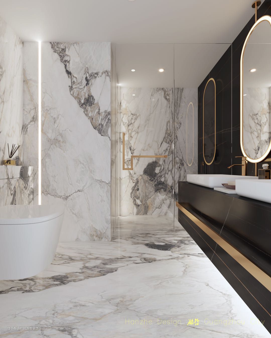 卫生间也是延续了黑白灰的格调,在带浅彩的岩板和线性灯和金属质感的装点后,显得明净敞亮。