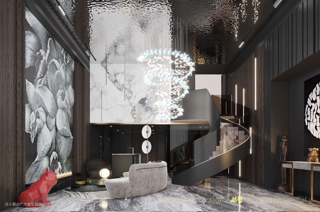 水波纹板的天花、极具美感的半椭圆形的楼梯,搭配墙面的线性装饰灯,给整个空间增加了层次感。