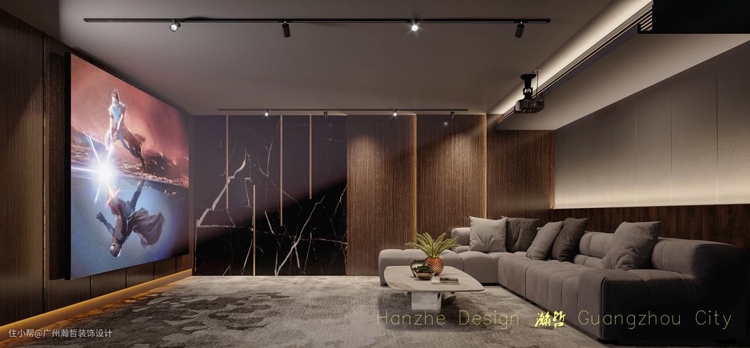 影音室里,酷黑的岩板墙面延续了客厅的高级黑格调,而暖木色的护墙板搭配暖色的黄光,以及天花和沙发背景的暖白色,使影音室既显高级却又不失温暖。