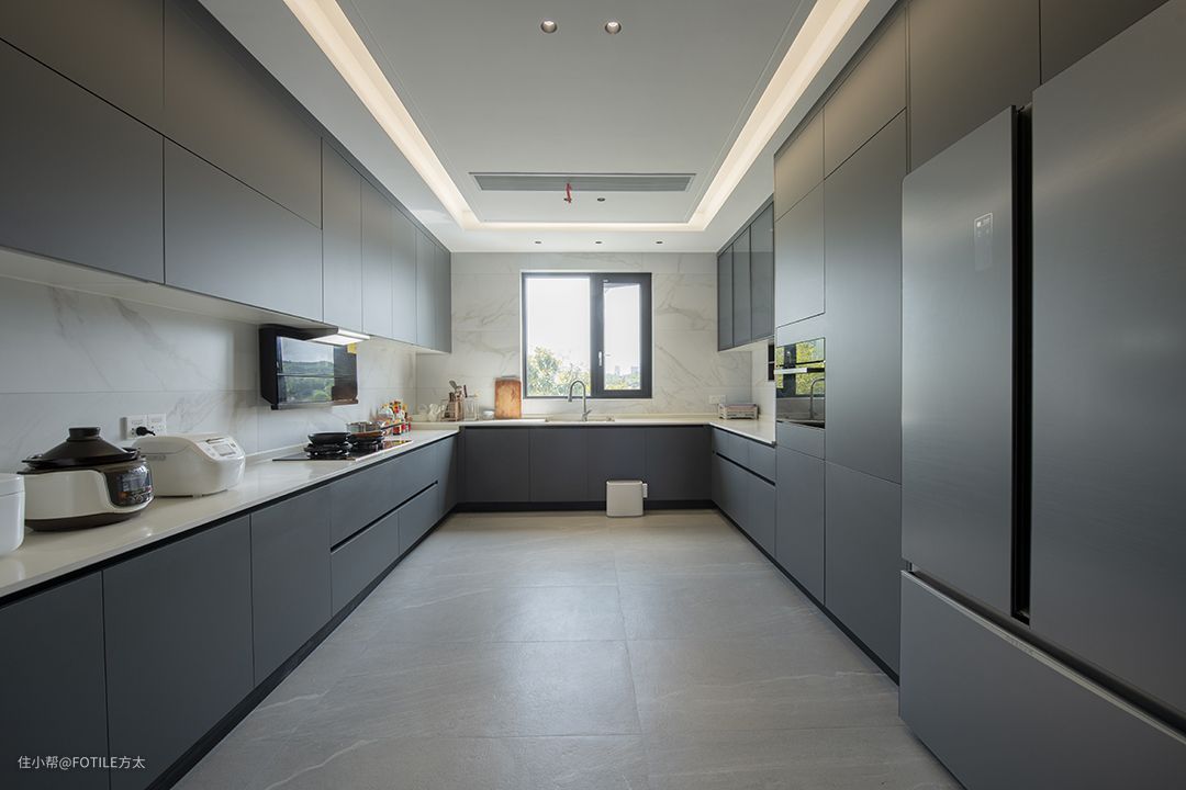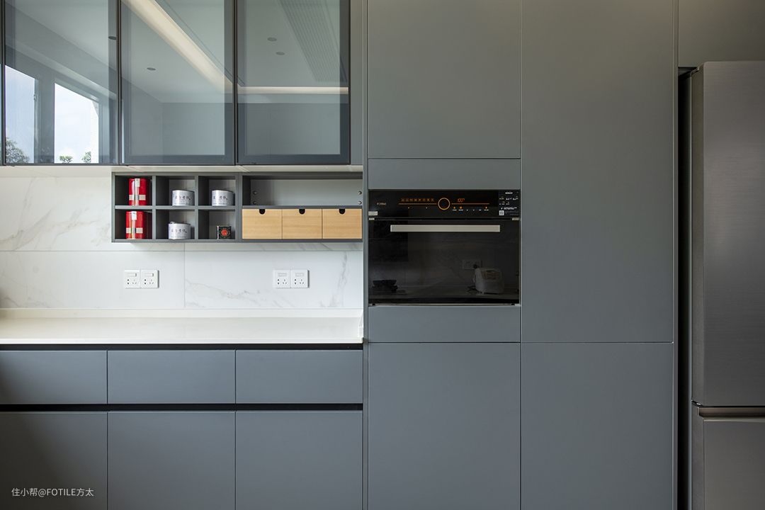 超大双开门冰箱与蒸烤箱采用内嵌模式,放眼望去,便是让人心情舒畅的平直的线条感。