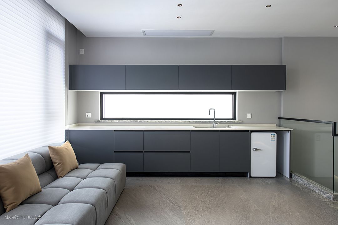 在小两口的主卧楼层,石头也在公共空间里安放了一个一字型厨房。