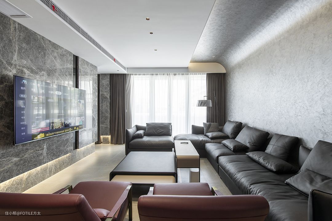 墨色磨砂感橱柜,深灰色冰箱,黑色真皮沙发,深灰暗纹窗帘与同色书架……在暖色灯光的衬托下,黑金工业风的未来感尤为强烈。