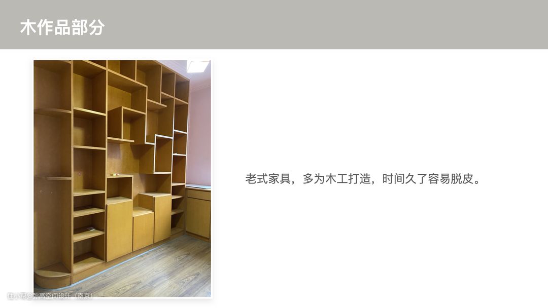 其实,从专业角度而言,以前的这种黄色手打家具多为木工板上面贴了层木皮装饰,再涂上油漆。甲醛的确是挥发的差不多了,但是它也有个缺点,就是木皮容易脱落。而且,枪钉钉眼比较明显,造型也跟不上现在的审美了。