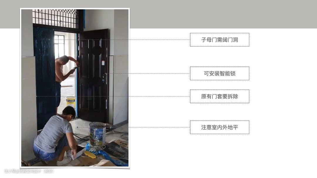 所以,如果老房子的入户门是这种老式门的话,小弥是建议大家做更换的。 并且,如果涉及到更换入户门,大多数情况下,还会涉及到更换门套、阔充门洞,粉刷门边,重新灌浆,更换过门石,甚至会影响屋内的找平层高度。