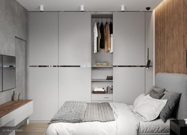 衣柜加装灯带方便找寻衣服兼照明,当卧室环境不够亮的情况下可以透过微微黄光找到适合的衣物。