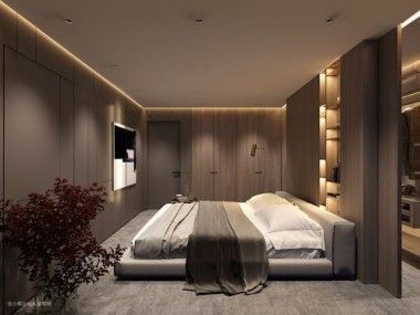 卧室的灯光设计要让其内部具有一体化的呈现,保证完整性和协调性,强调延续性和整体感。在天花、边吊安装射灯用于基础照明,为地毯、床、装饰画打光,保证空间的整体亮度。
