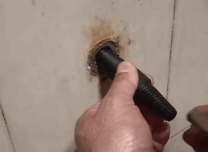 将取出器轻轻敲入水管,用细杆插入中部孔洞进行旋转拧动↓