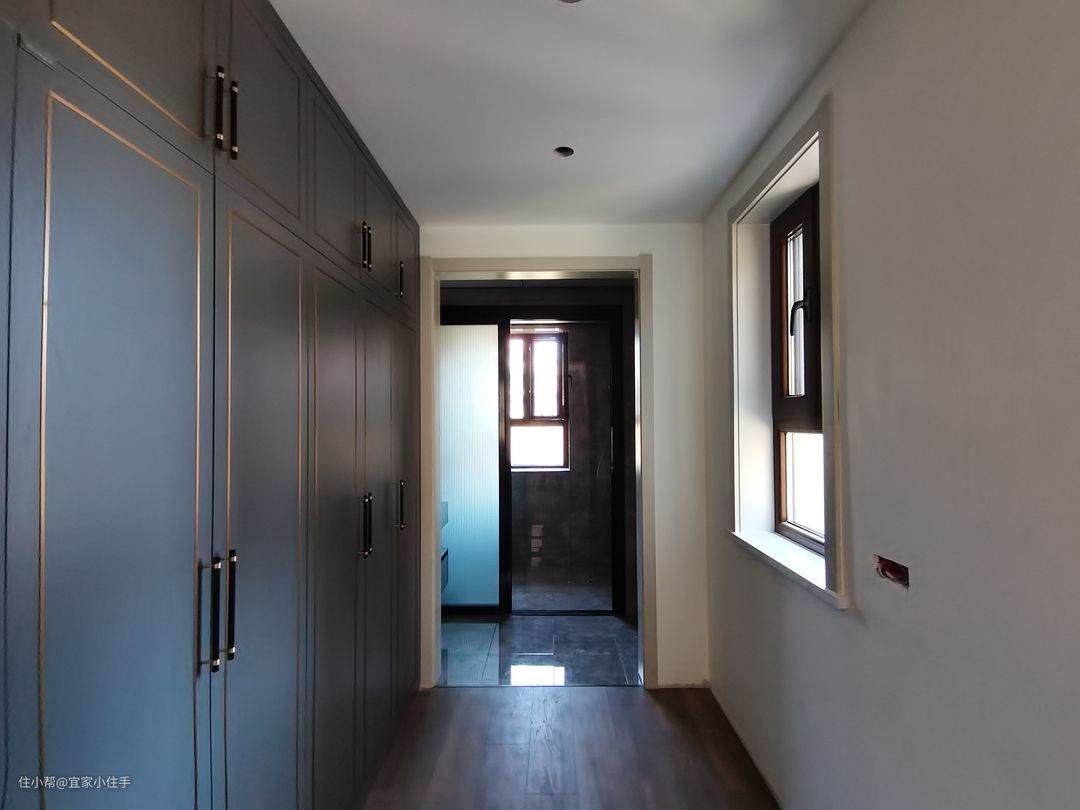 留出窗帘的位置,做了顶天立地的衣柜,主卧卫生间的区域也做了一排衣柜可以放一些换季的衣服等等,收纳空间充足够用。