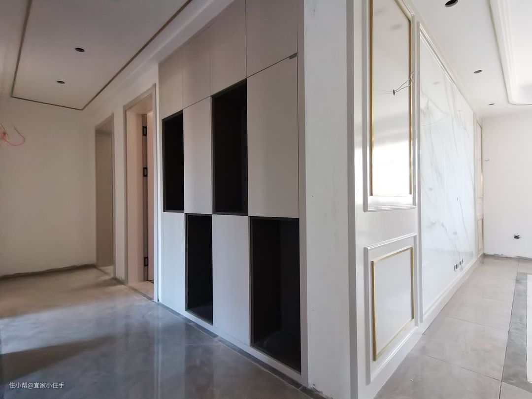 沿着墙面做了内嵌式的组合柜,开放格上下交错组合。将空间充分利用,将空间收纳最大化,满足业主的居住要求。