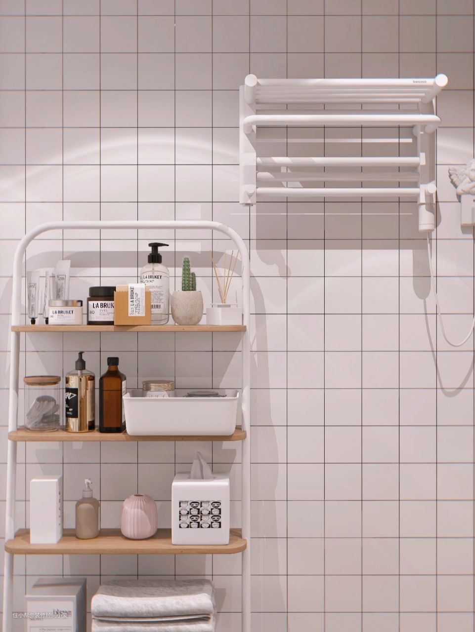 置物架旁还安装了电热毛巾架,毕竟住在南方,常年受湿气侵扰,安个电热毛巾架就是为了让毛巾始终保持干爽状态,别发霉了。