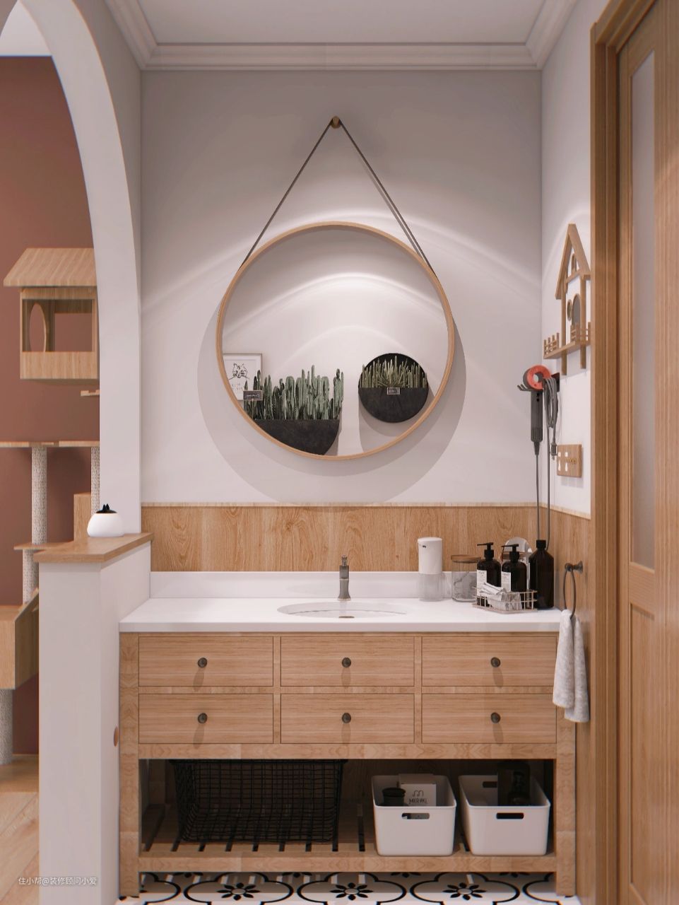 因为卫生间面积小,所以将浴室柜外移到过道处,用拱门和半墙进行区域划分,地面也有区别,一边是花砖,一边是木地板。