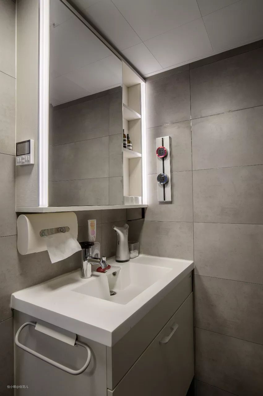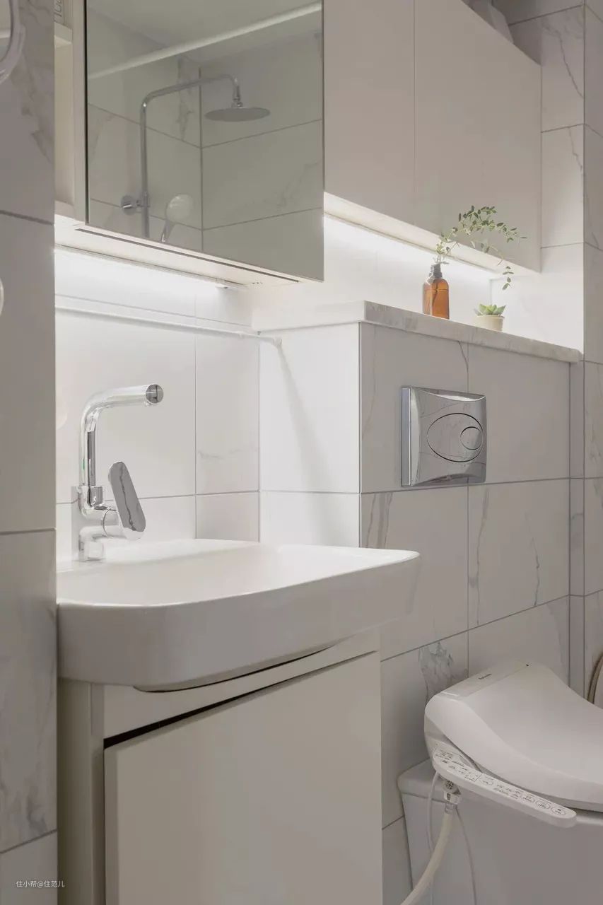 剩下的就是一些氛围灯光的点缀,面盆上方、镜柜下方、马桶区后方都能提前嵌入灯带;后期补救的话,买一个T5灯条贴起来就好了。